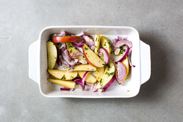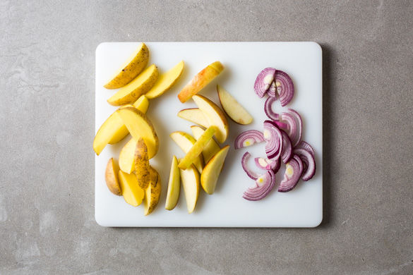 Den Backofen auf 200°C Umluft vorheizen. Die Kartoffeln in gleich große Spalten schneiden. Die Äpfel vierteln und vom Kerngehäuse befreien, dann ebenfalls in Spalten schneiden. Die Zwiebel schälen, halbieren und in grobe Streifen schneiden.