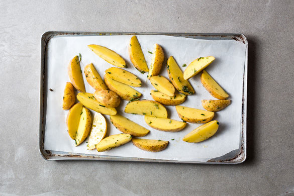 Den Rosmarin vom Strunk abstreifen, grob hacken und mit 3-4EL Olivenöl mischen. Die Kartoffeln mit Salz, Pfeffer und der Hälfte des Rosmarinöls vermengen und auf ein mit Backpapier ausgelegtes Backblech verteilen. Für ca. 20-25Min. im Ofen goldbraun backen.