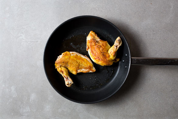 Das Hähnchen mit Salz und Pfeffer würzen und in einer großen Pfanne in 1-2EL Olivenöl ca. 2-3Min. von jeder Seite auf mittlerer Hitze anbraten.