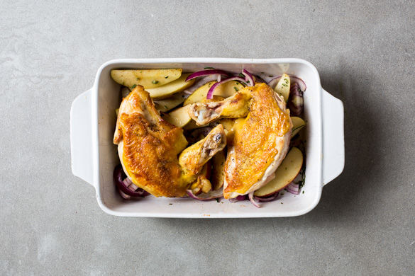 Die Hähnchen mit der Hautseite nach oben auf die Äpfel in der Auflaufform legen und alles für ca. 10-12Min. mit im Ofen garen.