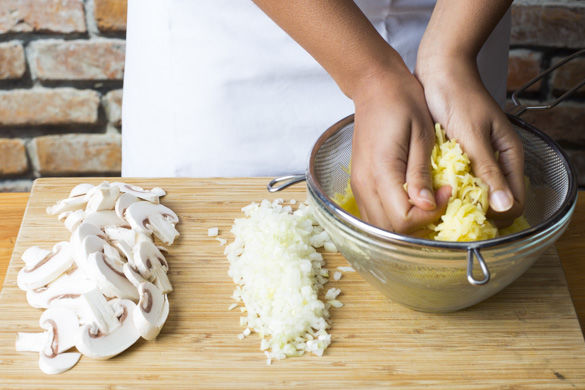 Den Ofen auf 200°C Umluft oder 220°C Ober-/Unterhitze vorheizen. Die Kartoffeln schälen und mit der groben Seite der Küchenreibe raspeln, überschüssige Flüssigkeit auswringen. Die Zwiebel schälen und fein hacken. Die Pilze mit etwas Küchenkrepp oder einer Bürste evtl. von Dreck befreien und in feine Scheiben schneiden.