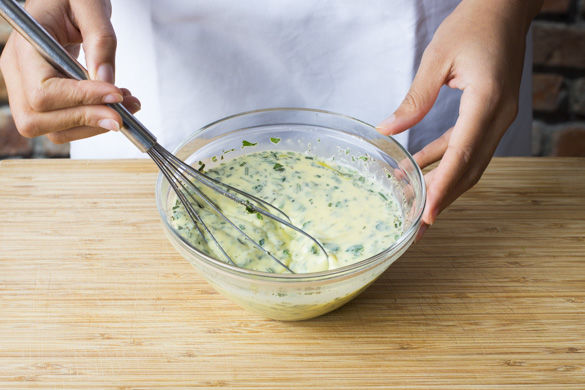 Inzwischen die Blätter des Rosmarins, Thymians und Salbei vom Stängel streifen und gemeinsam mit der Petersilie samt Stängel fein hacken. Die Eier mit Kräuter, Salz, Pfeffer und Milch mischen.