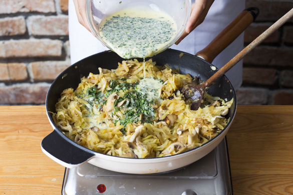 In einer großen, ofenfesten Pfanne die Zwiebeln und Pilze mit 1-2EL Olivenöl ca. 2-3Min. auf mittlerer Hitze anbraten, dann die Kartoffeln hinzufügen und weitere ca. 5-6Min. mitbraten. Mit Salz und Pfeffer würzen.