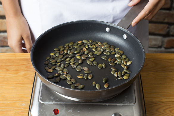 Inzwischen in einer kleinen Pfanne die Kürbiskerne ohne Öl auf mittlerer Hitze ca. 2-3Min. anrösten. Vorsicht! Sie können schnell anbrennen! Die Kerne aus der Pfanne nehmen.