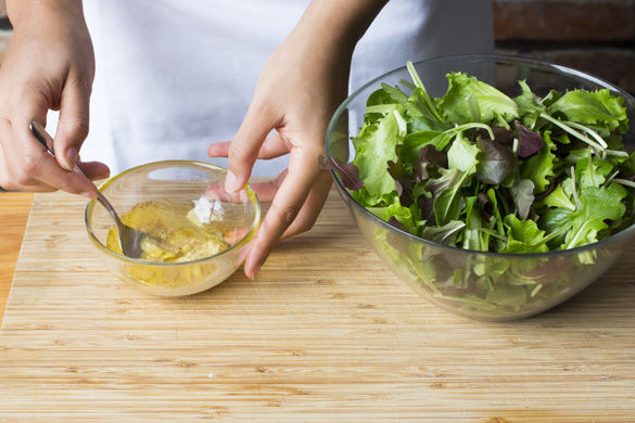 Den Senf mit 1EL Olivenöl und 1EL Essig sowie Salz und Pfeffer mischen. Den Salat kurz vor dem Servieren mit dem Dressing anmachen und mit Kürbiskernen garniert zu der Frittata servieren.