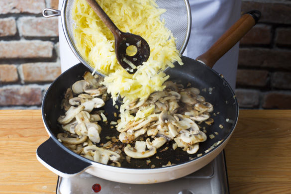 Den Ofen auf 200°C Umluft oder 220°C Ober-/Unterhitze vorheizen. Die Kartoffeln schälen und mit der groben Seite der Küchenreibe raspeln, überschüssige Flüssigkeit auswringen. Die Zwiebeln schälen und fein hacken. Die Pilze mit etwas Küchenkrepp oder einer Bürste evtl. von Dreck befreien und in feine Scheiben schneiden.