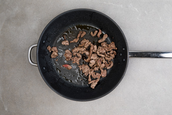 Das Fleisch mit etwas Küchenkrepp trocken tupfen und mit 1–2EL Olivenöl sowie Salz und Pfeffer einreiben. In einer großen Pfanne bei starker Hitze 1–2Min. rundum scharf anbraten, dann aus der Pfanne nehmen und abgedeckt beiseitestellen. Die Pfanne bis zur weiteren Verwendung aufbewahren.