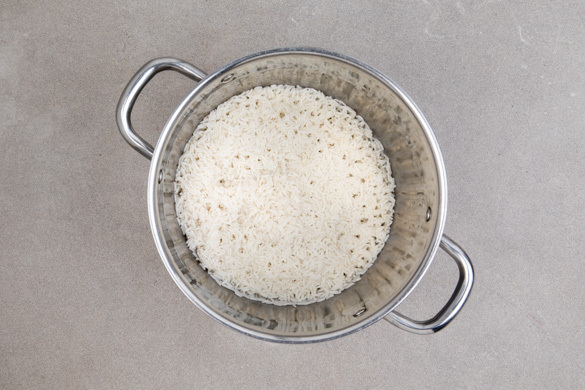 In einem mittelgroßen Topf 600ml leicht gesalzenes Wasser zum Kochen bringen. Den Reis in einem Sieb unter fließendem Wasser abspülen, bis das Wasser klar bleibt. Sobald das Wasser kocht, den Reis bei niedrigster Hitze abgedeckt 10–12Min. kochen, bis das Wasser aufgesogen und der Reis gar ist. Noch ca. 5Min. ohne Hitzezufuhr abgedeckt ziehen lassen.