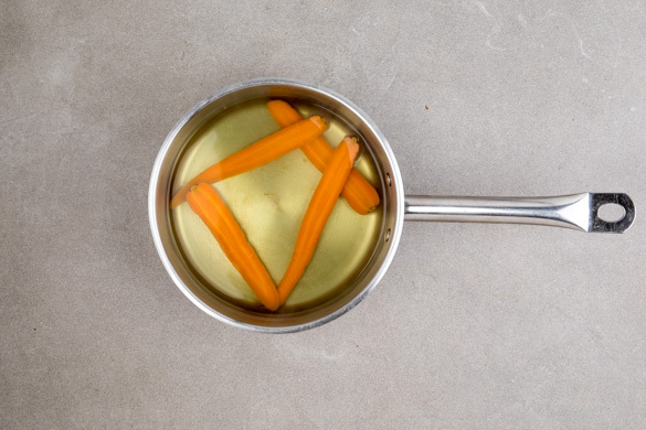 Die Karotten in einen kleinen Topf geben und mit dem restlichen heißen Wasser begießen. 1 Prise Salz hinzufügen und die Karotten bei mittlerer Hitze 7–8Min. kochen, bis sie bissfest sind. Das Wasser abgießen, die Karotten mit 1–2EL Olivenöl sowie Salz und Pfeffer verfeinern und bis zum Servieren warm halten.