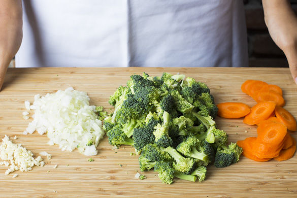 Die Zwiebeln und den Knoblauch schälen, halbieren und in feine Würfel schneiden. Den Brokkoli in ca. 1-2cm große Röschen schneiden. Die Karotten schälen, längs halbieren und in schräge, dünne Streifen schneiden.