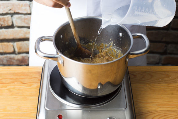 Die Zwiebel- und Knoblauchwürfel in einem mittleren Topf in 1-2EL Pflanzenöl ca. 2-3Min. anschwitzen, mit 2-3EL Mehl und der Hälfte des Garam Masala bestäuben und mit 600-800ml Wasser und der Teriyakisauce ablöschen. Dann den Brühwürfel hinzufügen und ca. 5-6Min. auf niedriger Hitze einköcheln lassen.