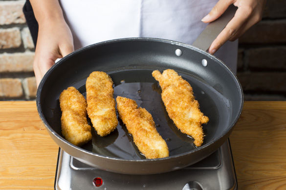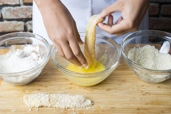 Die Hähnchenbrust einmal längs und quer in kleine Schnitzelchen halbieren. Mit Salz und Pfeffer würzen und in etwas Mehl wenden. Ein Ei mit etwas Wasser verquirlen und das Hähnchen darin wenden und zum Schluss in den Panko drehen und etwas andrücken.