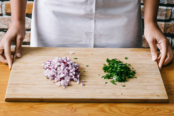 Inzwischen die Zwiebel schälen, halbieren und in feine Würfel schneiden. Die Petersilie vom Stängel abzupfen und fein schneiden.