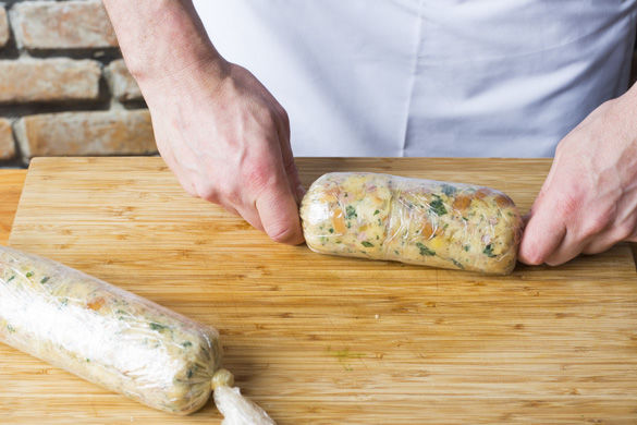 Nun 2-3 Lagen Klarsichtfolie leicht überlappend auslegen und einen Teil der Masse mittig darauf verteilen, wie eine Wurst eindrehen und die Enden zubinden. Mit dem restlichen Knödeteig wiederholen, bis ca. 2-3 gleichmäßig dicke Rollen entstanden sind. Die Rollen für ca. 15-20Min. im Wasser leicht köcheln lassen.
