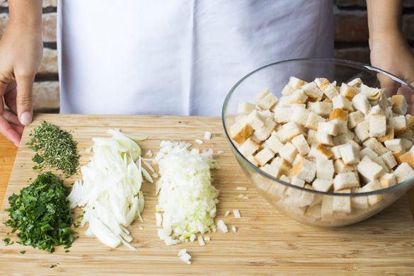 Einen großen Topf mit ausreichend Wasser für die Knödel aufsetzen. Den Ofen auf 200°C Umluft oder 220°C Ober-/Unterhitze vorheizen. Die Zwiebeln schälen, eine in feine Würfel schneiden, die zweite in feine Streifen. Das Brot in ca. 1cm große Würfel schneiden. Die Petersilie samt Stängel fein hacken, den Rosmarin vom Stängel streifen und fein hacken.