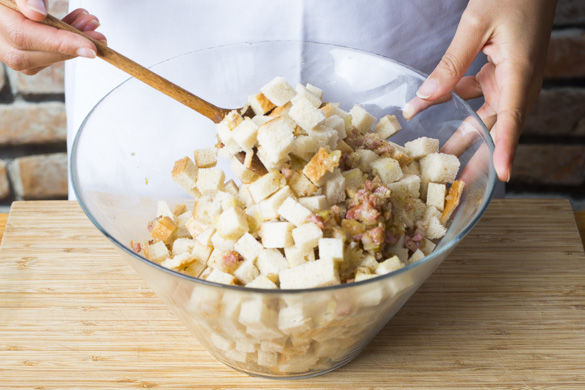 Den Speck mit den Zwiebelwürfeln in einem mittelgroßen Topf mit 1 EL Olivenöl ca. 3-4Min. auf mittlerer Hitze anbraten. Zu den Brotwürfeln geben, den Topf aufbewahren.
