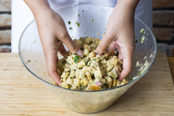 Die Milch mit der Hälfte des Brühwürfels auf mittlerer Hitze aufkochen, dann mit Rosmarin, Salz und Pfeffer sowie nach Geschmack mit Muskat abschmecken. Die Gewürzmilch mit den Eiern sowie 3/4 der Petersilie unter das Brot mischen und gut miteinander vermengen, mit Salz und Pfeffer abschmecken.