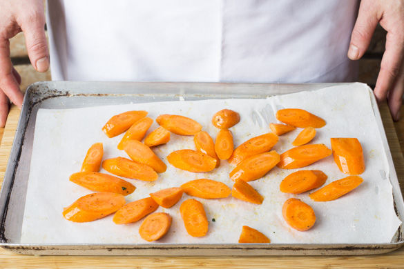 Inzwischen die Karotten schälen und in ca. 1cm schräge Scheiben schneiden, mit Salz, Pfeffer, 1 Prise Zucker und 1-2EL Olivenöl mischen und auf einem mit Backpapier ausgelegten Backblech im Ofen ca. 12-15Min. bissfest garen.