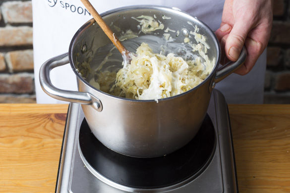 Die Zwiebelstreifen mit 1-2EL Olivenöl in den Specktopf ca. 2-3Min. auf mittlerer Hitze anschwitzen, das Sauerkraut ca. 2-3Min. mitbraten. Mit Crème frâiche, Salz, Pfeffer und dem restlichen Brühwürfel mischen und warm halten. Die Knödelrollen auspacken und in Scheiben schneiden, mit Sauerkraut, gerösteten Karotten und restlicher Petersilie servieren.