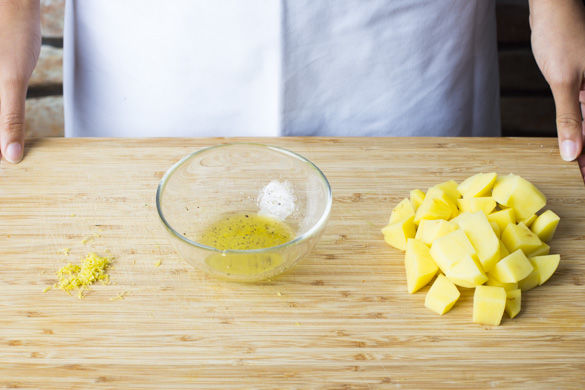 Die Schale der Zitrone abreiben und Zitrone entsaften. 2EL Olivenöl mit 1-2EL Zitronensaft, Salz und Pfeffer und nach Geschmack mit Zitronenabrieb mischen. (Wer es nicht bitter mag, lässt den Abrieb lieber weg). Die Kartoffeln schälen und in ca. 1cm große Würfel schneiden.