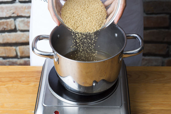 In einem Wasserkocher 275ml Wasser aufkochen und eine Hälfte des Brühwürfels darin auflösen. Die Brühe mit dem Couscous in einem mittleren Topf mischen und zugedeckt ca. 6-8Min. ziehen lassen.