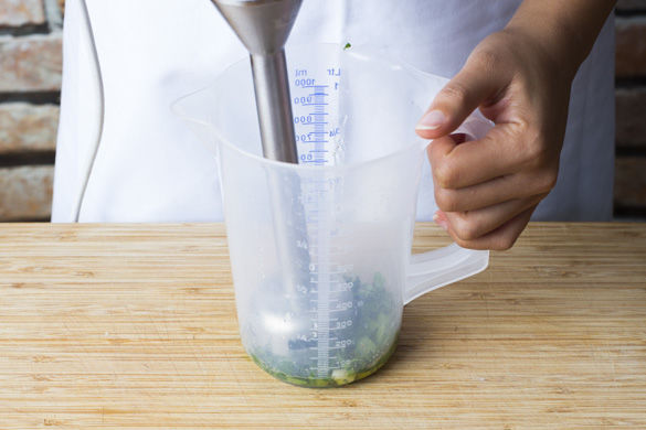 Die Petersilie samt Stängel grob hacken, Knoblauch schälen und grob hacken. Mit 1-2EL Olivenöl und 1-2EL Zitronensaft mischen und mit einem Stabmixer fein pürieren. Mit Gewürz sowie Salz und Pfeffer abschmecken.