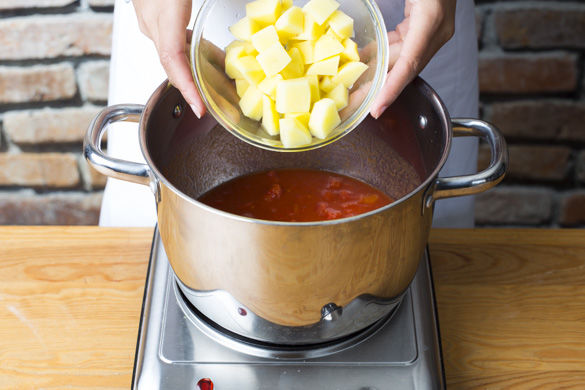In einem großen Topf die gehackten Tomaten mit 100-200ml Wasser auf mittlerer Hitze erwärmen und den restlichen Brühwürfel darin auflösen. Die Kartoffeln hinzugeben und alles ca. 10-12Min. köcheln.