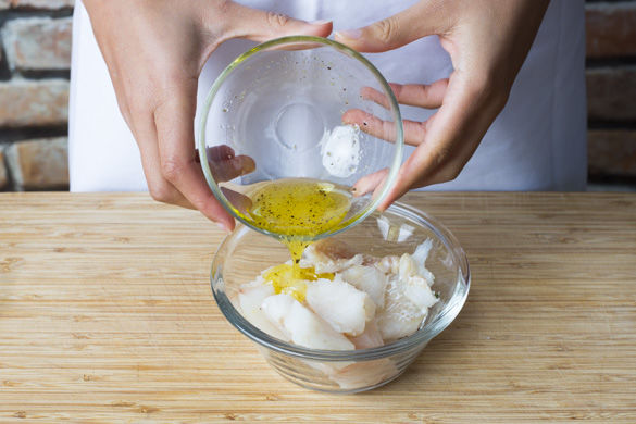 Inzwischen den Kabeljau in mundgerechte Stücke schneiden und in der Zitronen-Marinade wenden. Vorsicht! Kabeljau kann Gräten besitzen. Diese am besten mit einer Pinzette oder einer Flachzange herausziehen.