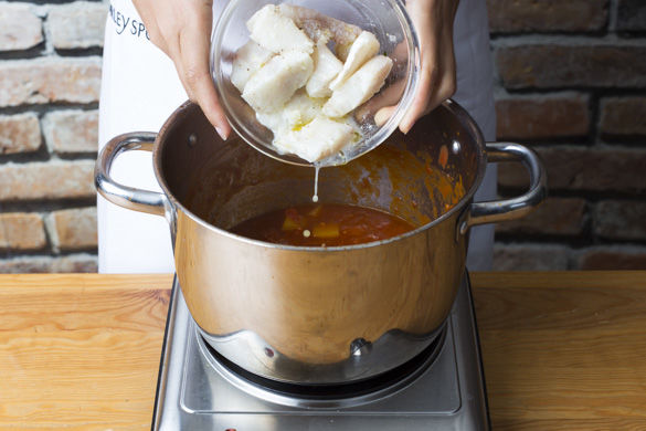 Zum Schluss den Fisch mit der Marinade zu der Sauce geben und nochmals ca. 5-6Min. ziehen lassen. Alles mit Salz und Pfeffer abschmecken. Mit Chermoula und Couscous servieren.