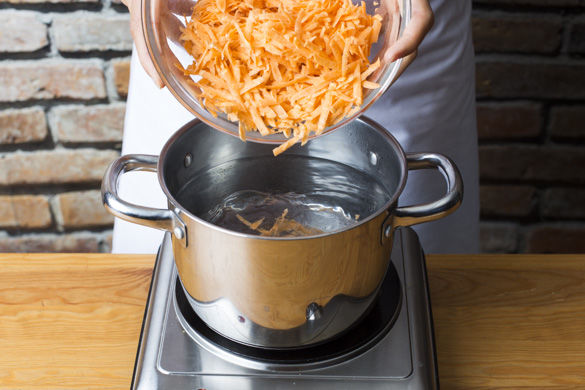 Den Backofen auf 210°C Umluft vorheizen. In einem mittelgroßen Topf ausreichend gesalzenes Wasser für die Süßkartoffeln zum Kochen bringen. Die Süßkartoffel schälen und mit der groben Seite der Küchenreibe raspeln oder in hauchfeine Scheiben hobeln.