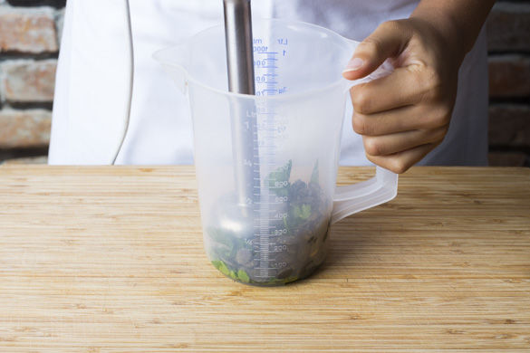 Inzwischen die Kräuter samt Stängel grob hacken. Den Käse in grobe Würfel schneiden. Die Kräuter mit ca. 2-3EL Olivenöl und der Hälfte der Kürbiskerne mithilfe eines Stabmixers fein pürieren. Die Käsewürfel dazugeben und kurz weitermixen, bis der Käse körnig geworden ist, ggfs. etwas Wasser hinzufügen.