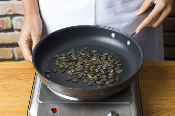 Die restliche Kürbiskerne in einer Pfanne ohne Fett anbraten. Vorsicht! Sie verbrennen schnell!