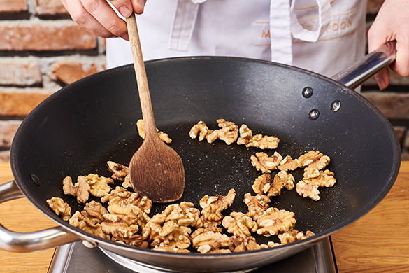 Die Walnüsse in einer Pfanne bei mittlerer Hitze ca. 2-3Min. leicht anrösten. Aus der Pfanne nehmen und Pfanne aufheben.
