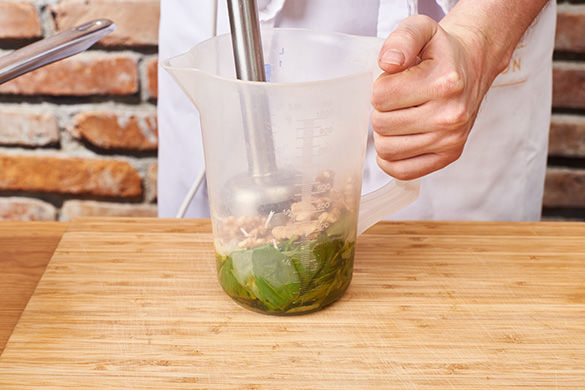 Den Basilikum von den Stängeln zupfen und in ein hohes Gefäß geben. Den Käse fein reiben. Die Hälfte des Käses und 3/4 der Walnüsse zu dem Basilikum geben und alles mit 2-3EL Olivenöl mit einem Stabmixer fein pürieren, mit Salz und Pfeffer abschmecken.
