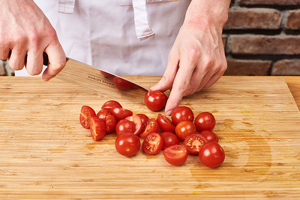 Die Tomaten halbieren. Sobald das Wasser kocht, die Pasta darin ca. 8-10Min. al dente kochen. 100ml Pastawasser abschöpfen, dann durch ein Sieb abgießen und warm stellen.