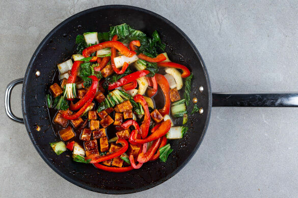 Heute gibt’s was richtig Feines: eine vegane Bowl, fernöstlich inspiriert und bis zum Rand gefüllt mit guten Sachen, die nicht nur dich, sondern auch deine Geschmacksknospen rundum glücklich machen! Auf leckeren Reisnudeln richtest du eine bunte Mischung aus gebratener Paprika und Pak Choi an, gekrönt wird das Ganze durch den würzigen, in Ingwer, Chili und Teriyakisauce marinierten Tofu. Yum!