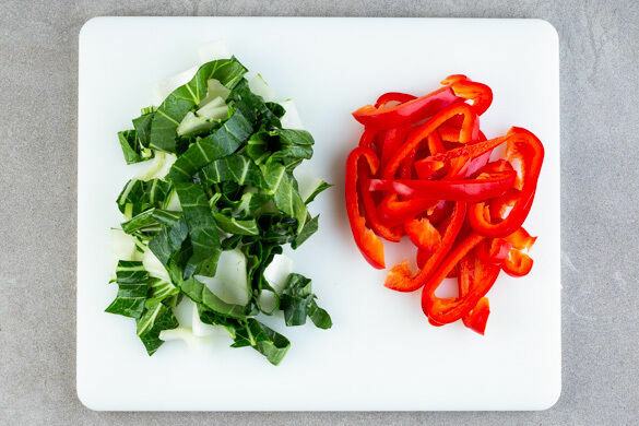 Die Paprika vierteln, entkernen und in dünne Streifen schneiden. Den Pak Choi in ca. 1cm breite Streifen schneiden.