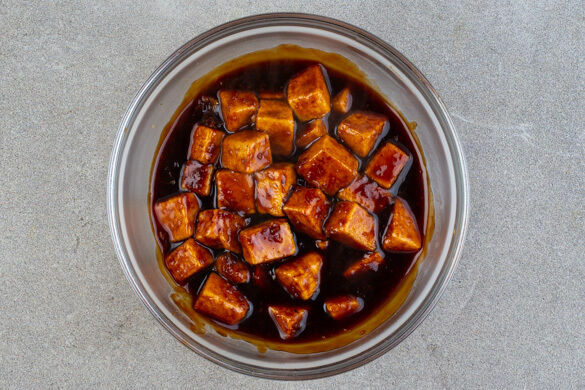 Den Tofu in einer großen Pfanne mit 2EL Pflanzenöl bei mittlerer Hitze 4–5Min. rundum anbraten. Die Knoblauch-Ingwer-Paste und die Chilipaste nach Geschmack unterrühren, dann mit der Teriyakisauce und 100ml Wasser ablöschen. Den Tofu noch ca. 2Min. sanft köcheln lassen, dann mit der Sauce aus der Pfanne nehmen und beiseitestellen.