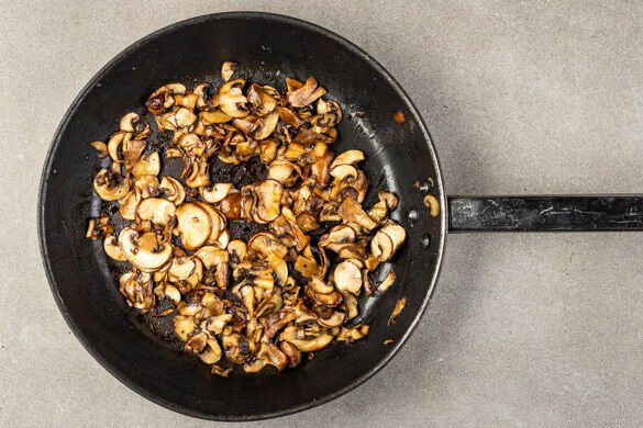 Die Pilze ggf. säubern, in dünne Scheiben schneiden und in derselben Pfanne mit 2EL Butter und 1 kräftigen Prise Salz bei mittlerer Hitze in 5–6Min. goldbraun braten.