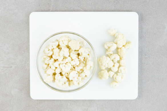Den Blumenkohl in kleine Röschen zerteilen, den Strunk in kleine Würfel schneiden. Ca. 100g Blumenkohlröschen für die Garnitur beiseitelegen.