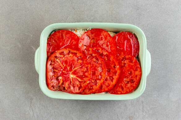 Die Tomatenscheiben auf der Pasta verteilen und mit 1EL Olivenöl beträufeln, dann die Auflaufform mit Alufolie abdecken und die Pasta im Ofen 10–15Min. überbacken.