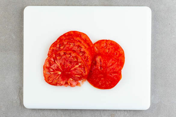 Die Tomate in ca. 0,5cm dünne Scheiben schneiden.