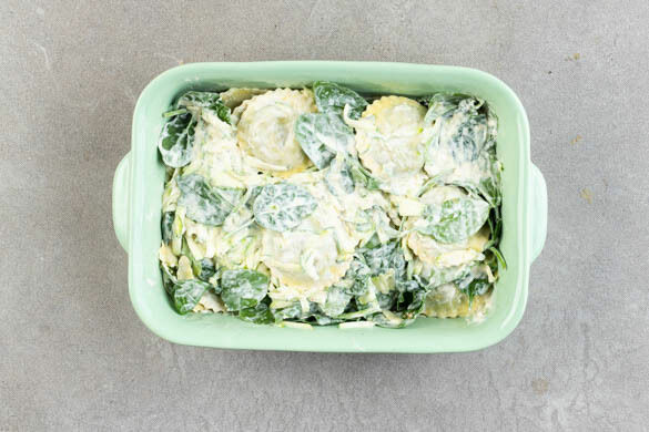 Die Zucchini, den Spinat und die Pasta in die Auflaufform geben und vorsichtig vermengen, sodass die Pasta mit dem Gemüse und der Sauce bedeckt ist. Dann die Pasta mit dem Käse bestreuen.