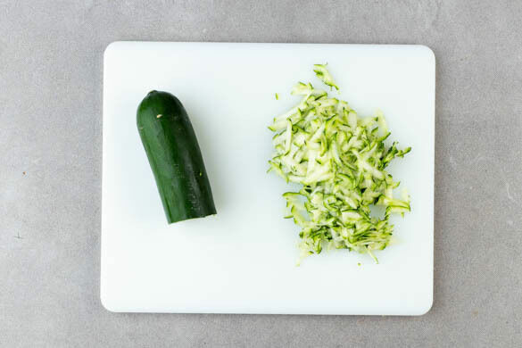 Den Ofen auf 240°C (220°C Umluft) vorheizen. In einem großen Topf 1,6L Wasser zum Kochen bringen. Eine Zucchini mit einer Küchenreibe grob raspeln.