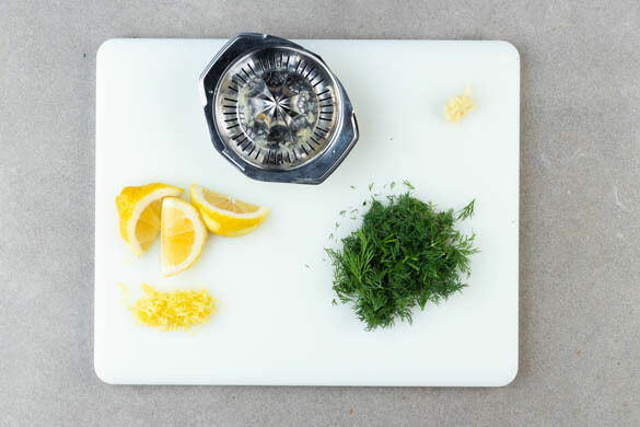 Den Knoblauch schälen und durch eine Knoblauchpresse drücken. Den Dill samt Stängeln grob schneiden. Die Schale einer Zitrone abreiben, dann die Zitrone halbieren und auspressen. Die andere Zitrone in Spalten schneiden.