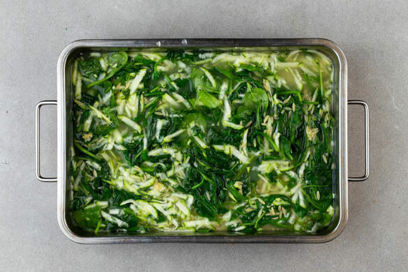 Den Spinat, die Pasta, die geraspelte Zucchini, den Knoblauch, das Brühgewürz, den Zitronensaft und die ½ des Dills ins kochende Wasser geben. Alles gut vermengen und dann in zwei große Auflaufformen füllen.