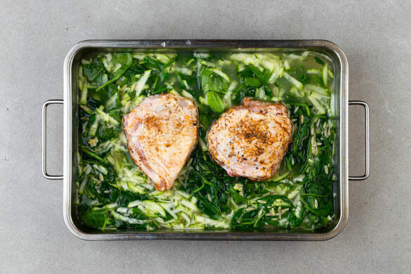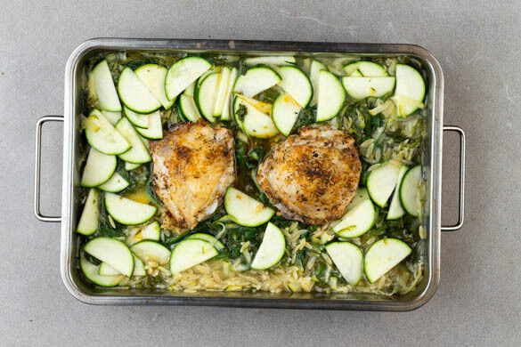 Du suchst nach einem Essen, das deine gesamte Familie glücklich macht? Da kommt dieser Auflauf gerade richtig: Die reisförmige Risonipasta ist besonders bei kleinen Kindern ein Hit, das Knabbern an Hähnchenkeulen auch bei großen. Dazwischen versteckt hat sich allerlei gutes Grün: Zucchini, Spinat und frischer Dill lockern unseren Auflauf auf und liegen nicht schwer im Magen. Wenig Abwasch ist aber auch nicht schlimm, oder?