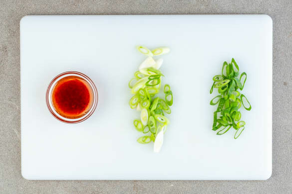 In einem mittelgroßen Topf ausreichend gesalzenes Wasser für die Nudeln zum Kochen bringen. Das Sesamöl mit 1TL Sambal Badjak verrühren und mit 1 Prise Salz würzen. Die Lauchzwiebel schräg in feine Ringe schneiden, den weißen und grünen Teil getrennt voneinander aufbewahren.