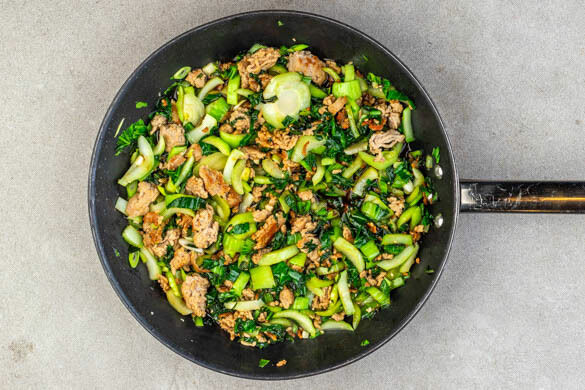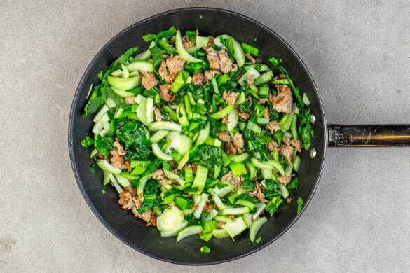 Das Hackfleisch in einer großen Pfanne mit 1TL Pflanzenöl bei mittlerer Hitze 4–5Min. goldbraun anbraten. Den Pak Choi längs halbieren und quer in feine Streifen schneiden, in die Pfanne geben und 3–4Min. mitbraten.