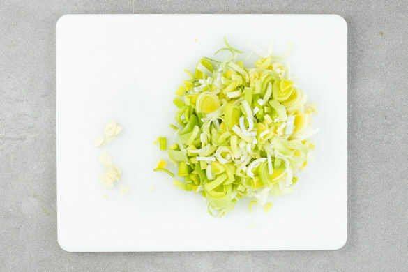 Den Lauch längs halbieren und in ca. 1cm breite Streifen schneiden. Den Knoblauch schälen und in feine Scheibchen schneiden.